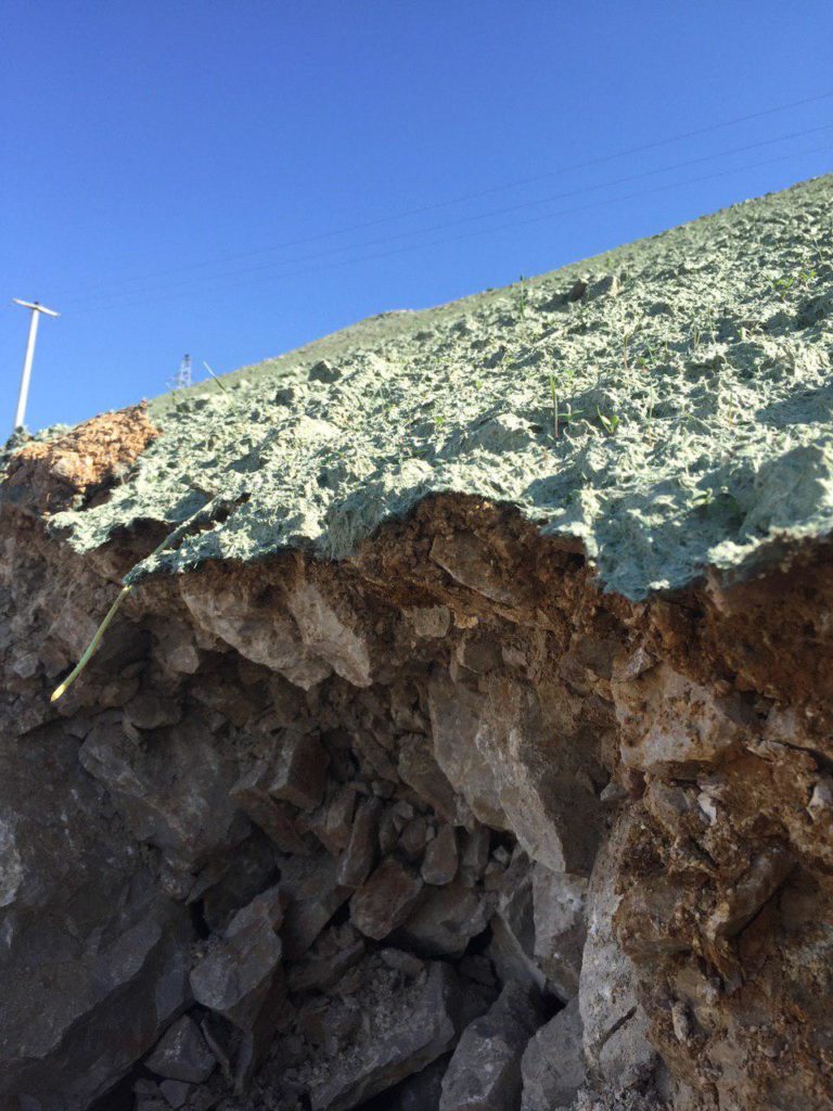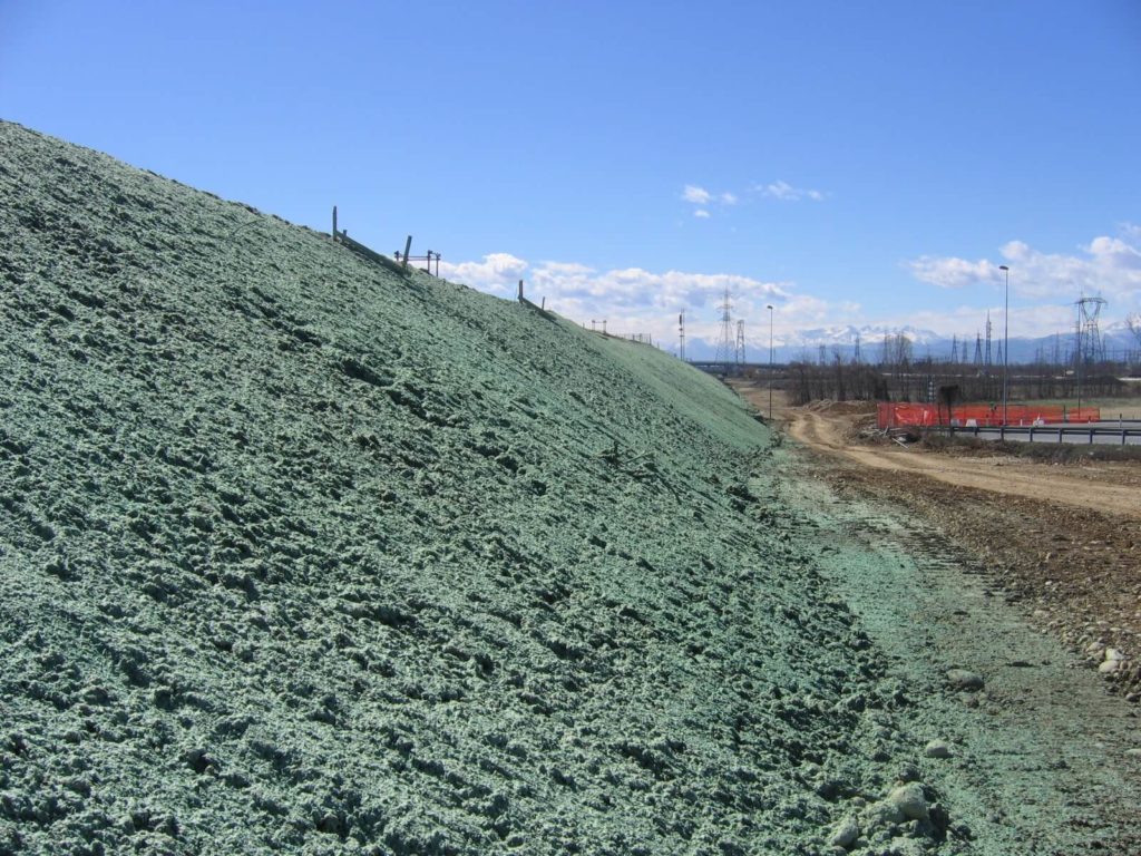 Im Bereich des Erosionsschutzes können wir in stark erosionsgefährdeten Bereichen mit unseren Geräten einen speziellen, matrixförmigen Fasermulch in einer Stärke von 150 g – 600 g je m2 auftragen – immer in Abhängigkeit von Gefälle und den Bodenverhältnissen. Somit ist die Fläche unmittelbar nach Aufbringung (max. 24 Std Abtrocknungszeit) vor Erosion geschützt. So lassen sich selbst humusarme, felsige Untergründe durch Beimischung von organischem Material begrünen und damit vor Erosion schützen.