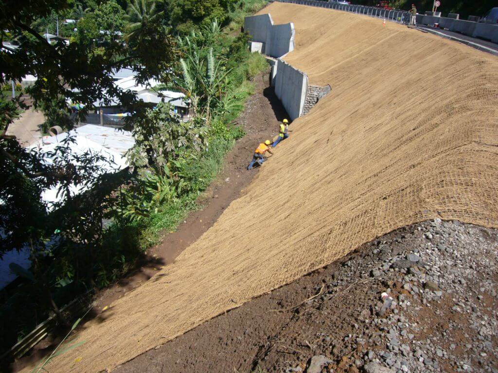 Herkömmliche Geotextilien wie Erosionsschutzmatten aus Holzwolle, Jute- oder Kokosfasern haben den Nachteil, dass Regen- und Oberflächenwasser durch diese Matten sickern kann und die Feinanteile des darunter liegenden Bodens allmählich weggespült werden. Wenn die Bereiche unter den Erosionsschutzmatten dann mit der Zeit ausgehöhlt wurden, kommt es zu Erosionen unterhalb der Matten und machen den Erosionsschutz gegebenenfalls wirkungslos.